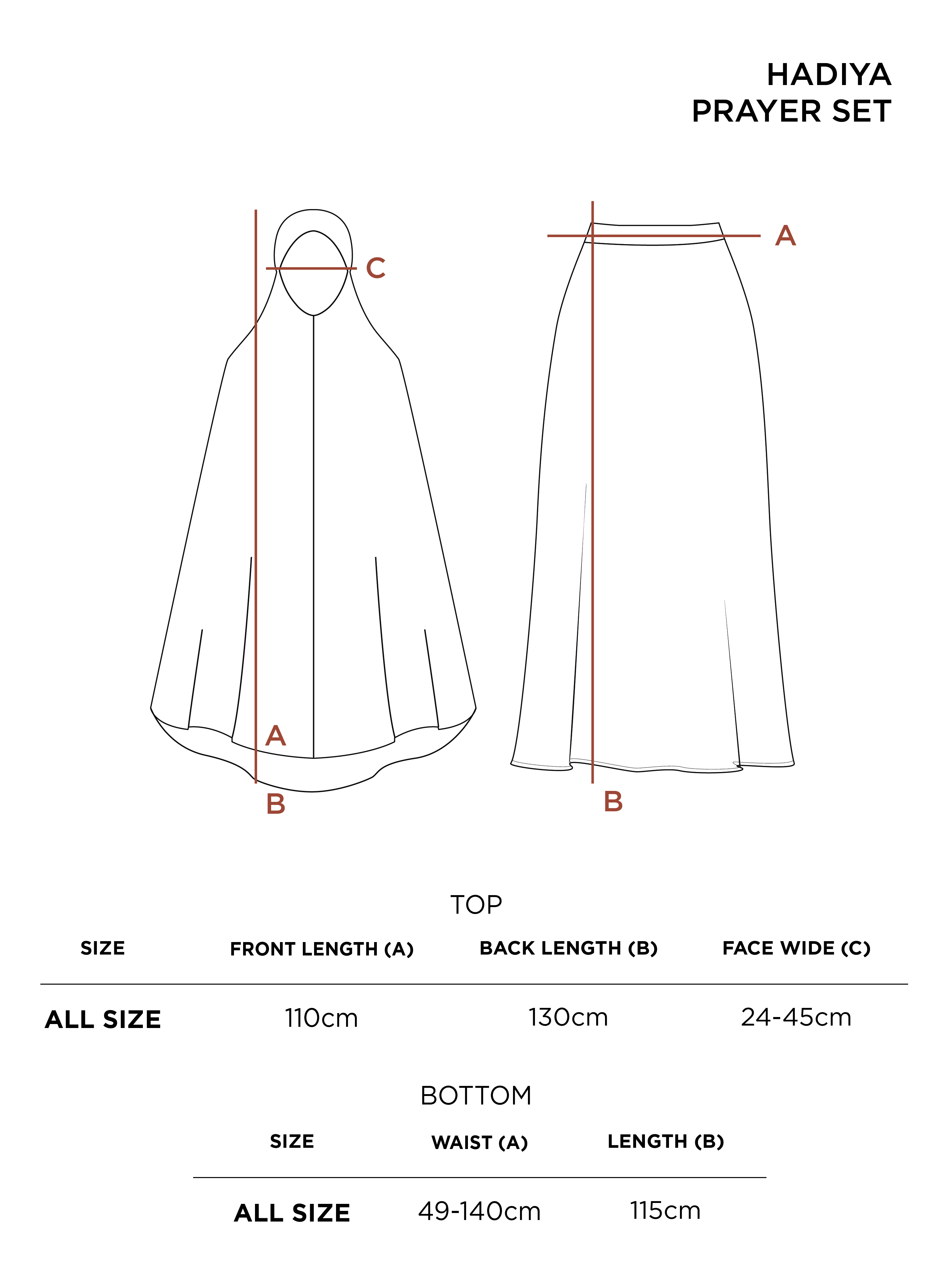 • Satu set mukena kerudung & rok dilengkapi dengan tas, pouch mukena, sajadah kepala dan sarung